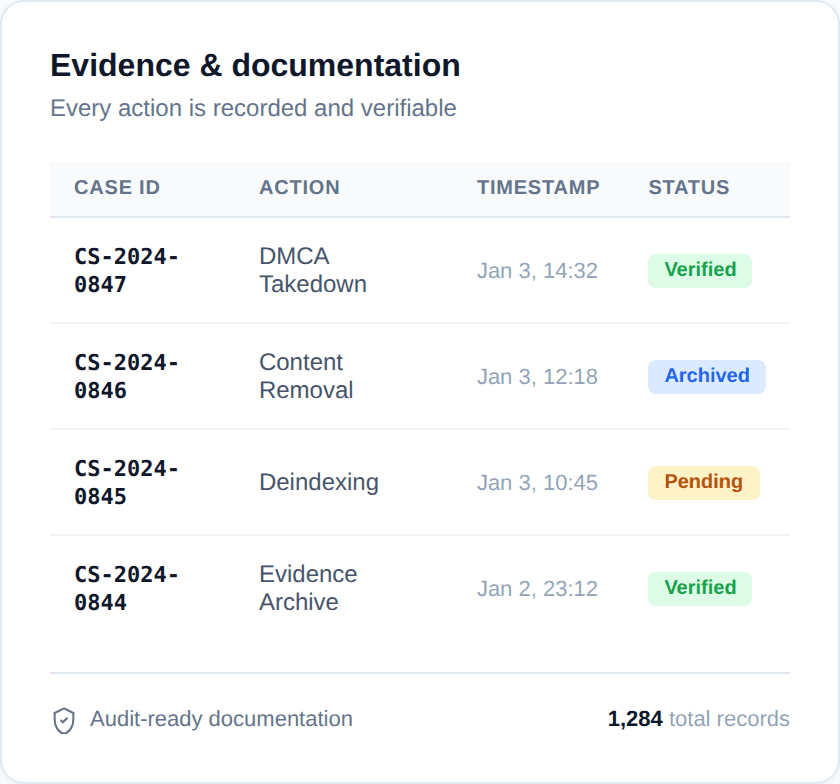 Every action is recorded and verifiable. Evidence is captured, archived, and linked to each case automatically.