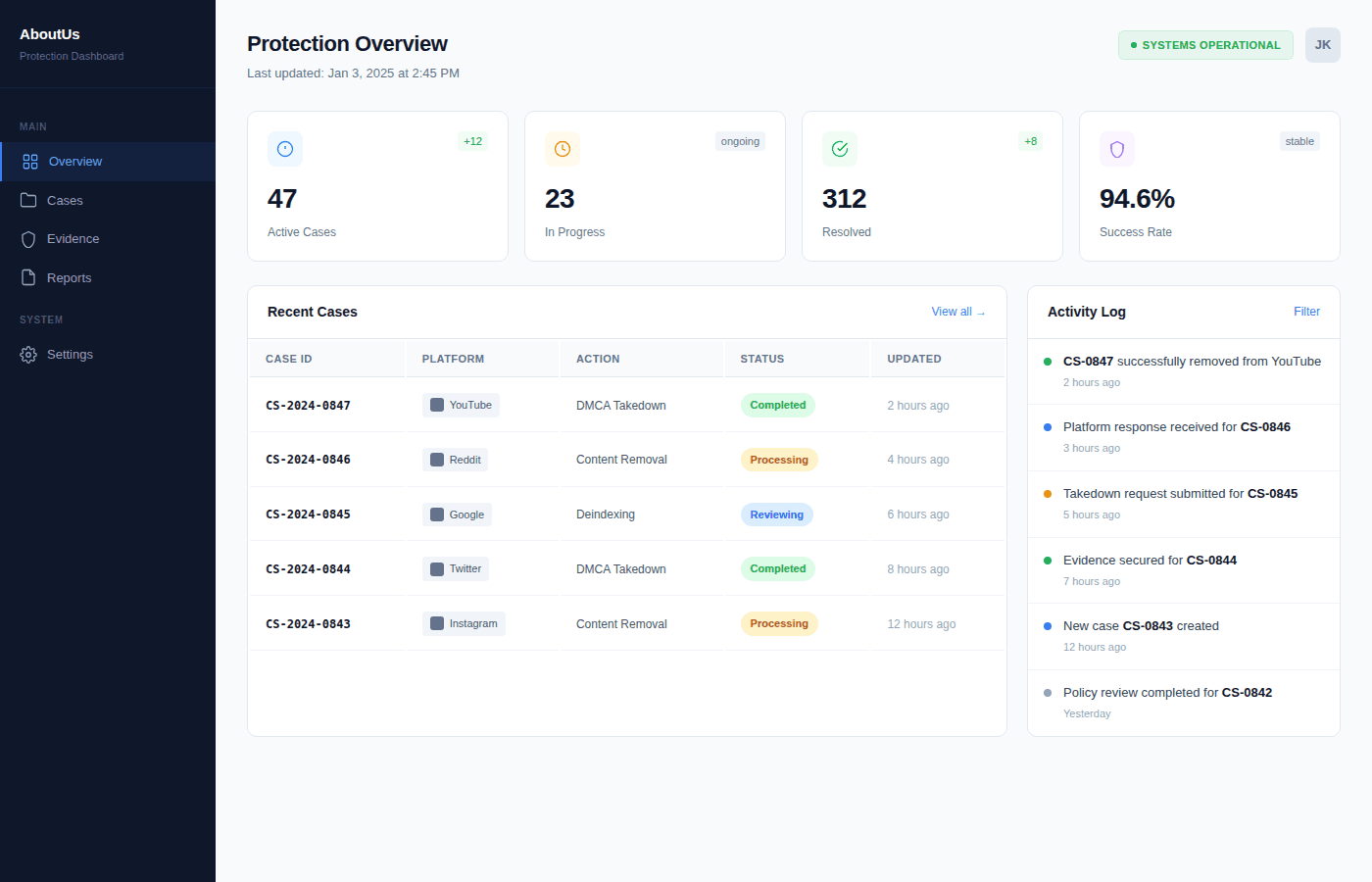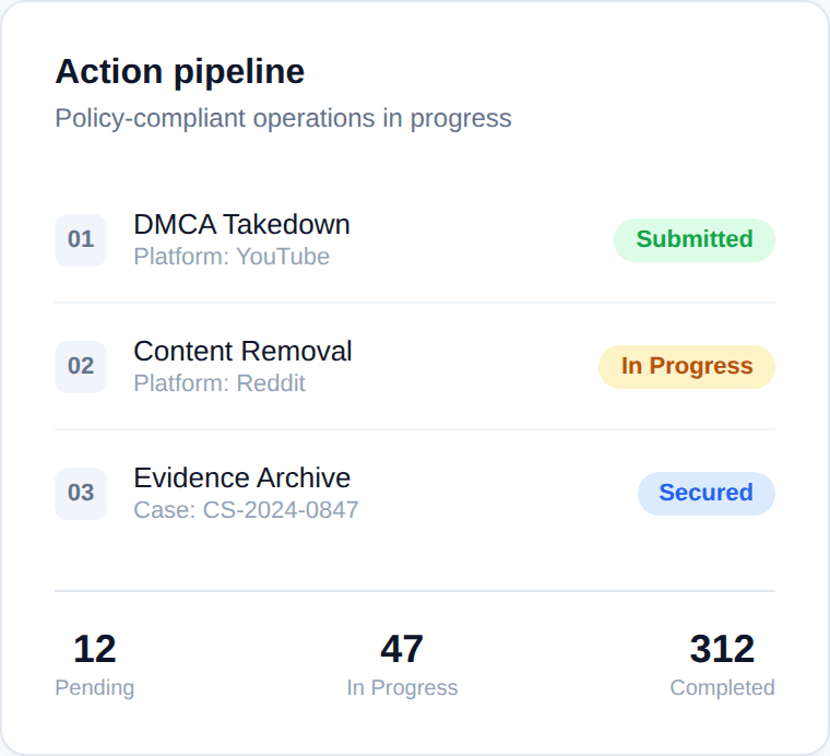 We assess the content against platform policies, prepare evidence, submit the appropriate request, and track the outcome through verification and monitoring. Every step is logged and reviewable.